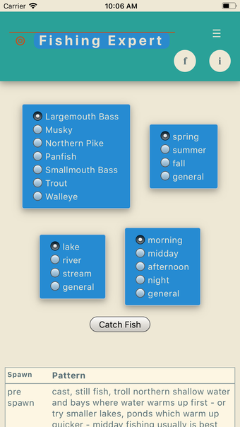 แอปพลิเคชันนี้มีฐานข้อมูลอัจฉริยะที่มีมากกว่า 250 คำแนะนำในการตกปลาสำหรับสายพันธุ์ปลาต่าง ๆ รวมถึงปลาบาส (ปลาปากกว้างและปลาปากกว้าง), ปลาทราย (ปลาบรุ๊ค, ปลาบราวน์, และปลาเรนโบว์ทราย), มัสกี้, วอลเลย์, ซาเกอร์, ปลาไหลเหนือ, แครปปี, และปลาสลิด (ปลาดุกและปลาบลูกกิล) เมื่อคุณไปตกปลา แอปพลิเคชันจะให้คุณเลือกเงื่อนไขที่คุณจะตกปลาภายใต้ และโดยอ้างอิงจากการเลือกของคุณ มันจะให้คำแนะนำหรือรูปแบบการตกปลาที่ได้ผลหรือมากกว่าหนึ่งรูปแบบ ปัจจัยเช่น สภาพอากาศ, ช่วงเวลาของปี, ประเภทของน้ำ, เวลาของวัน, ลม, เงื่อนไขการผสมพันธุ์, ระบบความดันสูง/ต่ำ, และความคมชัดของน้ำ ถูกพิจารณา